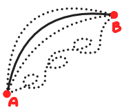 \[S = \int_{t_1}^{t_2} \mathcal L(q, \dot q) dt\]Lo especial de esta fórmula es que, combinada con una condición que veremos en un segundo (\(\delta S = 0\)), nos revela qué camino seguirá un sistema físico entre dos momentos \(t_1\) y \(t_2\). Si lo pensamos bien, para ir de una posición \(a\) a una posición \(b\) existen infinitos caminos, desde la línea recta hasta una divagación aleatoria en miles lazos (figura 1), pero la naturaleza siempre sabe cuál escoger entre ellos. Pues bien, el camino escogido es aquel que mantiene a la acción \(S\) estacionaria (donde la primera derivada es nula):