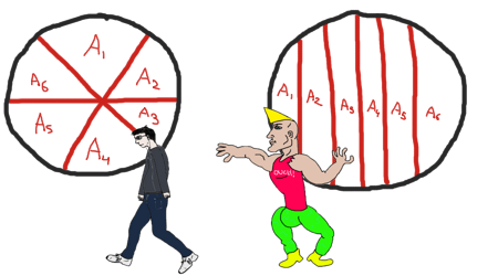 Hace ya dos años, en una sesión de procrastinación incitada por el algoritmo de YouTube, me tropecé con un vídeo que me hizo especial gracia, cuyo título es exactamente el mismo que el de este post, pero en inglés. En el vídeo, un chico explicaba la forma correcta de cortar una pizza, la forma que un auténtico chad usaría, haciendo cortes verticales, en vez de radiales, pero asegurándose de que el área delimitada por cada uno sea la misma. Aunque nunca terminé de verlo, la idea se ha quedado grabada en mi backlog mental, así que vamos a explorarla.